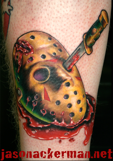 this tattoo of the jason voorhies hockey mask from friday the 13th was alot of fun for me to do.. i did it on a great guy that came in from north carolina, i learned alot while doing this tattoo and the guy that got sat like a champ
