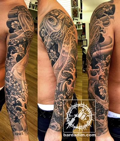 Couple of Koi fishes and sakura blossoms at Black and Grey Japanese tattoo sleeve.