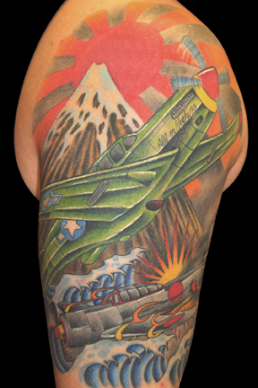 Believe it or not, this WW2 half sleeve is on a 19 year old client named Josh, who has been fascinated by the World Wars for as long as he can remember. Josh came in wanting a P51 Mustang shooting down a Japanese Zero, so Dave came up with an over water dogfight scene, with Mt. Fuji and the Rising Sun of Japan in the background. Since then a Kabuki style samurai mask has been added to the inside. Check back for updates. Dave Tedder