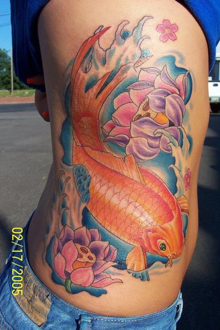 Koi Fish and Lotus Flower Rib Tattoo