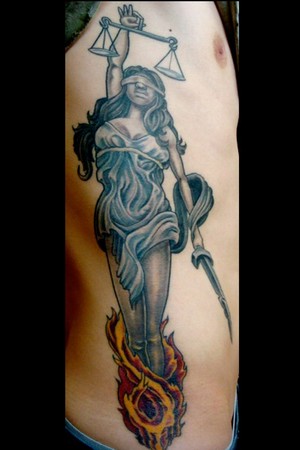 A large scale lady justice on the rib cage. Besides the fire i used subtle hints of color thru out the piece. The dress is true black and grey while the body is traditional black and grey small subtle creamy yellow highlights in specific spots