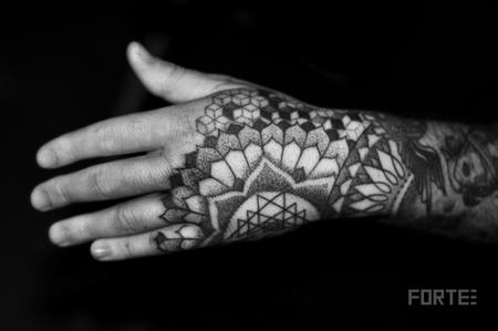 9/8/12 Mandala blackwork dotwork hand tattoo I did on the awesome photographer Joey Colombo. I had fun with this and will be adding more to it soon!