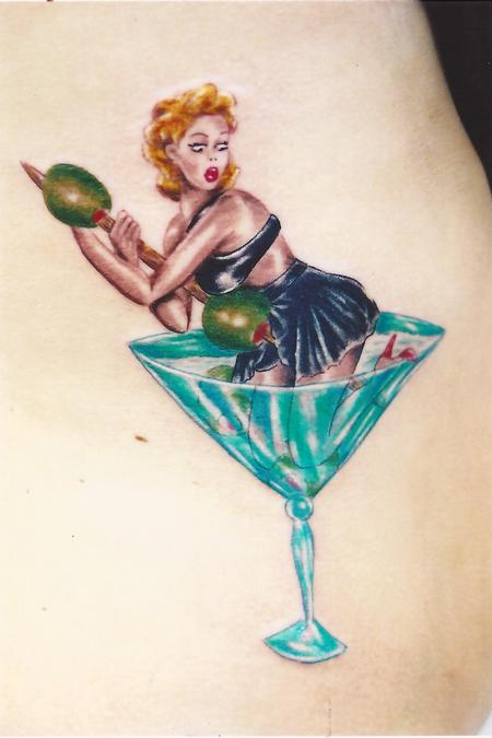 Pinup girl tattoo designed into a martini glass with olives.