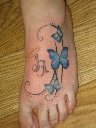 This is a memorial tattoo for the client's mom, with a halo, swirlies, and butterflies.