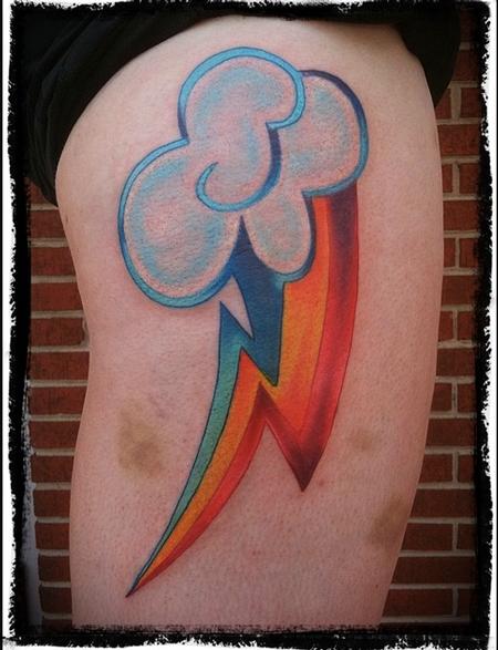 My Little Pony. Rainbow Dash is a pegasus pony with a sky blue body and a multicolored mane and tail. She has a rainbow on the clouds as her symbol. Here is the Rainbow Dash symbol tattoo that I did on one of her biggest fans.