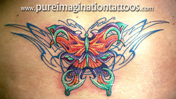 This tattoo is my favorite among a growing portfolio of custom fantasy butterflies, with meticulous pinstripes, or new school tribal.