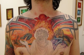 My client came to me with Jesus ghosted in and the surrounding tribal. We started with putting in the apocalyptic background based on CD cover art from Acacia Strain and some images from video games for the ruined buildings and tornado. Another break from my usual requests, this colorful piece is definitely a favorite project right now!