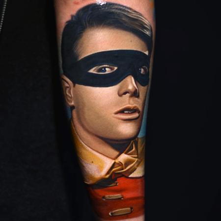 I loved the original batman show when I was a young boy. It was cool to tattoo this. #BurtWard #Robin#Batman #DCcomics #adamwest@blackanchorcollective@blackanchorbynikko @stencilanchored
