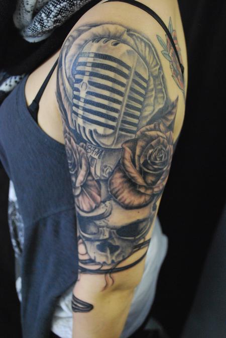 Skull and microphone with roses in black and grey