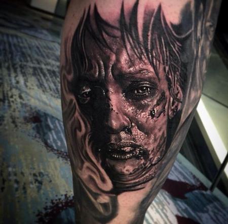 A portrait of a beat-up Uma Thurman from one of the 'Kill Bill' movies by Quentin Tarantino. Added on a collector who has an awesome Quentin Tarantino leg sleeve in the works!