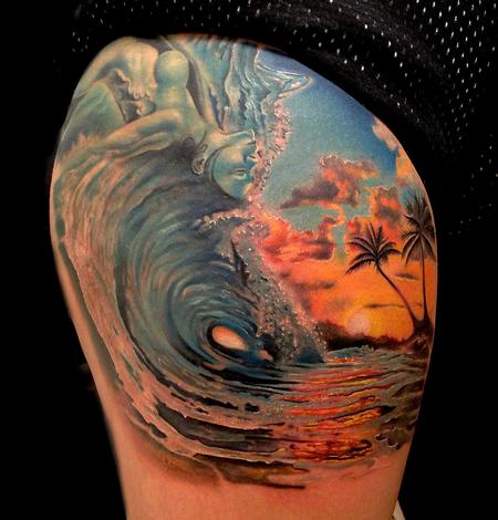 This was a brightly colored piece that I did on a client from Dallas, Texas. I was able to use different techniques to capture the 3D effect in the waves and island scenery. I incorporated a woman in the waves to givethis tattoo a distinctive look of its own.
