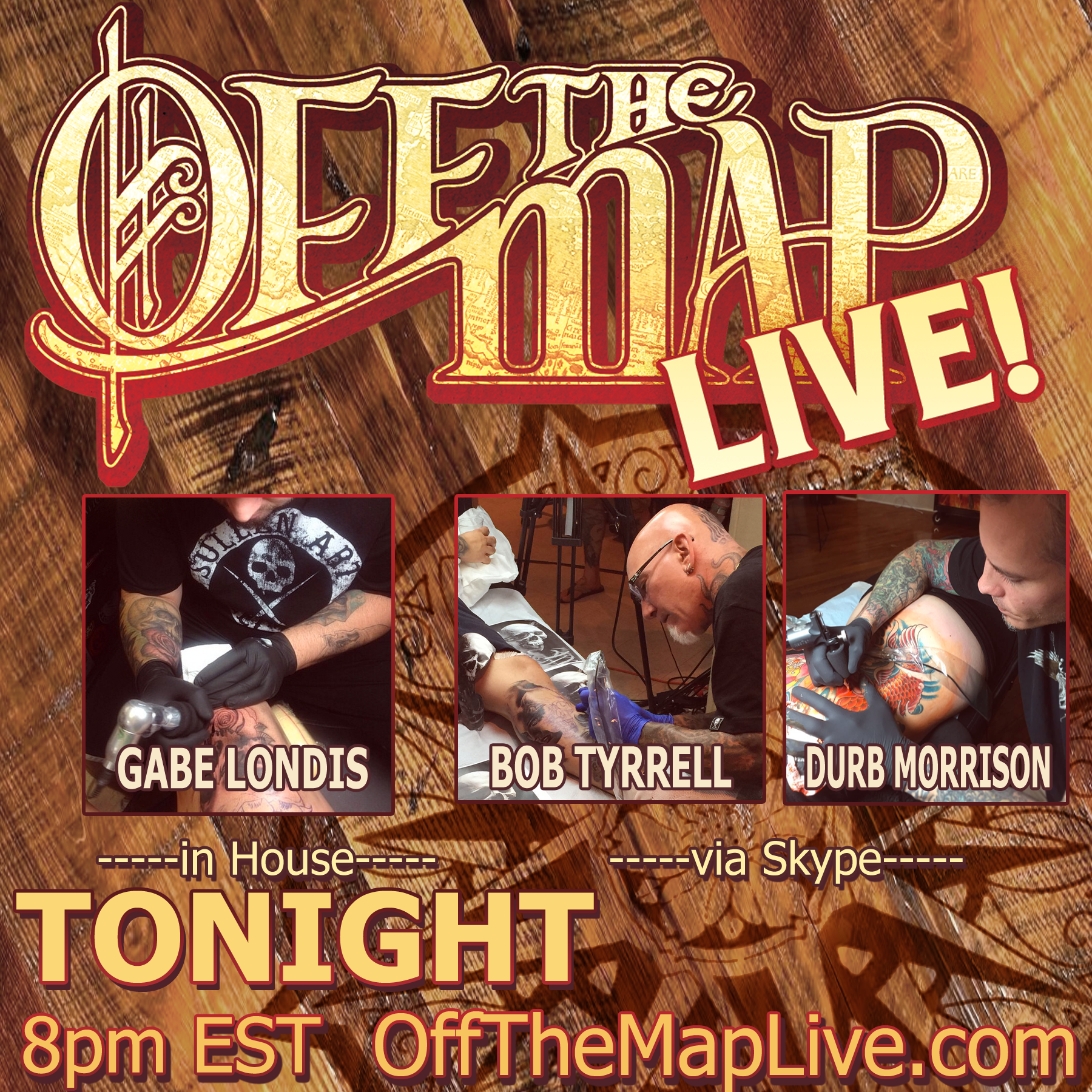 Tonight, April 3rd, we will be having Off the Map resident artist Gabe Londis in studio with us! We'll also be Skyping-in with the legendaries, Bob Tyrrell and Durb Morrison! We'll be talking tattooing, travel, education and health!